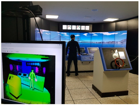 As global trade has grown in recent decades, the shipping industry has grown dramatically in response. Safety requirements have become increasingly important [1]. To ensure the safety of maritime transportation, scientific measures should be taken to respond to and prevent the various types of maritime accidents instead of putting ambiguous anticipations of possible human errors into place [2,3,4]. Navigator error was involved in 79% of accidents in the Republic of Korea over the past five years, based on a recent assessment [5]. Moreover, inappropriate behaviors accounted for 49% of all maritime accidents [6]. Although the majority of maritime accidents were directly related to navigator error, evidence of the navigator error has not yet been explored objectively [7]. Most existing assessments of navigators’ lookout behaviors have depended on indirect data-collection methods such as diaries, surveys, and questionnaires [8,9,10]. Harma et al. used self-reported diaries and questionnaires to investigate the situational awareness of navigators related to lookout activity patterns [11]. The use of such indirect approaches remains a subjective limitation for the accurate monitoring of the lookout behavior of navigators during navigation. This limitation could be addressed using more objective data-collection measures for navigator behavior, such as eye trackers and optical sensors. Lutzhoft and Dukic conducted eye tracker-based research to investigate the association between the allocation of navigational equipment and navigation safety in the simulated environment [12]. Moreover, the eye tracker was also utilized to evaluate the navigational workload and concentration in the given navigational environment [13,14]. However, there is still a lack of investigation into navigators’ physical behavior to measure lookout activity patterns. The purpose of this study was to establish a classification model for lookout behaviors using the Kinect sensor in a simulated navigation environment.