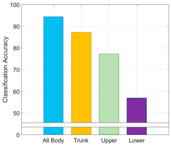 To determine the efficiency of the classification of lookout activities based on the movement feature categories, the 25 movement features were grouped into the following groups: trunk, upper limbs, and lower limbs. When the selected lookout movement features for each group were given to classify the same training data, the results of classification provided a rationale determining the efficiency for each group of movement features. As shown in Figure 6, there was an 87.1% accuracy in the classification of lookout activities using the trunk features, including base of the spine, mid-spine, neck, head, left hip, right hip, and shoulder-height spine; the determination of the 12 upper-limb features had a 77.1% accuracy. The six lower-limb features (i.e., left knee, left ankle, left foot, right knee, right ankle, and right foot) had the lowest classification accuracy, at 56.9%.