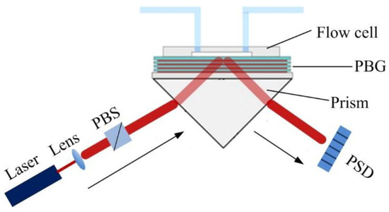 The experimental setup is based on a typical Kretschmann–Raether prism-coupled configuration. As shown in Figure 5, the 1D PBG device is attached to a high-index SF10 prism (n = 1.704), and a flow cell made of polydimethylsiloxane (PDMS) is attached to the buffer layer side of the device. A 980 nm fiber-pigtailed Fabry–Perot laser is used as the light source, whose output is collimated by a lens (f = 12 mm) and set to TM polarization using a Polarization Beam Splitter (PBS). The collimated beam has a waist of ~800 μm. The Bloch surface wave is then excited by the incident light when water is injected into the flow cell and clads the buffer layer of the device [19]. As the Block surface wave can strongly enhance the GH shift to sub-millimeter magnitude, the resulting lateral shift is detected by the Position Sensitive Detector (PSD) (Hamamatsu Photonics, S3979).
