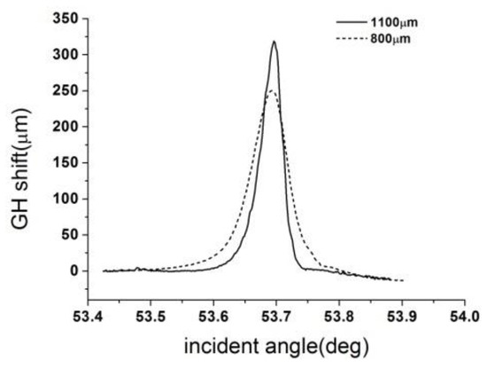 During the experiment, the prism and the Block surface wave device are placed on a motorized rotation stage, which is controlled by a stepper motor to change the incident angle. Total internal reflection occurs when the incident angle is greater than the critical angle. The incident angle is continuously changed from 53.4 deg to 53.9 deg by rotating the motorized rotation stage, among which the Bloch surface wave is excited, and the PSD is used to record the shift of the reflected beam. As the said 1D PDG device is only designed to excite the Block surface wave for TM polarization in this angular range, TE polarization could be used as the reference for GH shift measurement. Therefore, that the GH shift could be retrieved by subtracting the PSD readout for TM polarization from that for TE polarization. As shown in Figure 7, the maximum of the GH shift is obtained when incident angle equals to 53.69 deg, where the Block surface wave is excited.