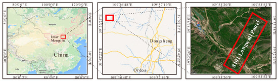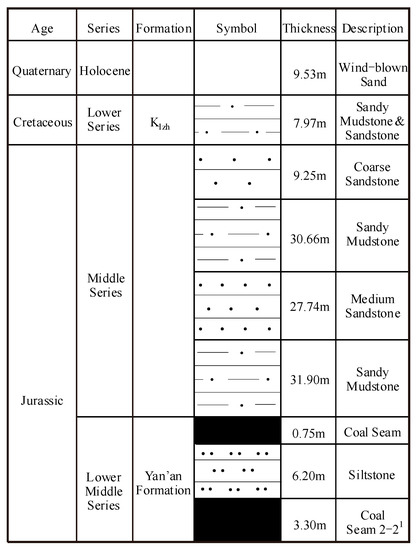 The Selian No. 1 coal mine lies in the Dongsheng District of Ordos, Inner Mongolia (39°53′52.85″ N, 109°52′37.49″ E). Characterized by a fluctuating surface, the terrain of this area is high in the north and low in the south (Figure 1). The gullies are widely developed in and around this area, and the rivers are seasonal. The recorded maximum flood peak of the around area is 2580 m3/h. The 8101 longwall face is the first longwall face in this coal mine in which the 2-21 coal seam is mined. The strike length and the inclined length of the 8101 longwall face are 1780 m and 280 m, respectively. The ground elevation is 1382–1442 m, and the floor elevation is 1250–1264 m. The average depth is approximately 170 m, and the thickness of the coal seam ranges from 2.5 to 5.0 m, with an average of 4.0 m. There is a river (dry at that time) passing through the surface of the 8101 longwall face, beneath which the buried depth of the 2-21 coal seam is approximately 125 m.