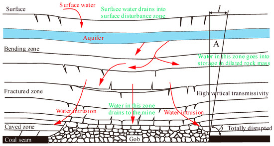 The three zones of the overlying strata are shown in Figure 3. The caved zone is located in the lowest part of the overlying strata. There is ample space between the rocks in this zone, which leads to strong connectivity. Water and sand can burst into the longwall panel through this tunnel. The fractured zone is located above the caving zone. Although the lithology changes little compared to the original strata, the fractures that generally exist in this zone promote the development of the water-conducting channel through which water can move downward to the goaf. The WFFZ is composed of the caved zone and the fractured zone. The bending zone refers to the strata between the top of the fractured zone and the surface. There are few fractures in this zone, and the water conductivity remains unchanged. Sometimes, the fractured zone can develop up to the surface when mining the shallow-buried longwall face. In this case, the overlying strata can be divided into two zones: the caved zone and the fractured zone.