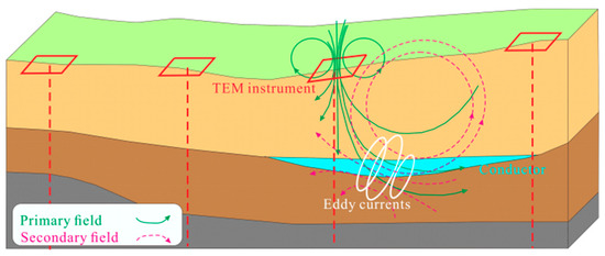 The working principle of the TEM method is shown in Figure 4. Generally, a current with a certain waveform (generally square wave) is passed through a transmitting coil. A pulsed primary electromagnetic field is generated in front of it. When the current is turned off, the primary electromagnetic field gradually decays and then disappears. The underground geological body generates an induced eddy current, which generates an attenuated secondary field carrying the electrical properties of the geological body. The receiving coil records the induced electromotive force of the secondary field. Then we can analyze the distribution rules of the underground geological body.