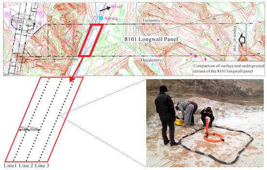 According to the geological conditions of the 8101 longwall face, the central loop TEM method was adopted to survey the riverbed above the longwall face (Figure 5). The parameters are as follows: the transmitting voltage is 24 V, the transmitting current is 2 A, and the transmitting frequency is 25 HZ (time range of 0.08–8.4 ms). The multiturn transmitter loop is 2.0 m × 2.0 m with 64 turns, and the multiturn circular receiver loop is 40 turns with a diameter of 1.0 m. The survey area is a parallelogram with the adjacent sides 300 m and 100 m in length. There are three survey lines in the survey area, with 30 survey points in each line. The point spread is 10 m, and the line spread is 30 m.