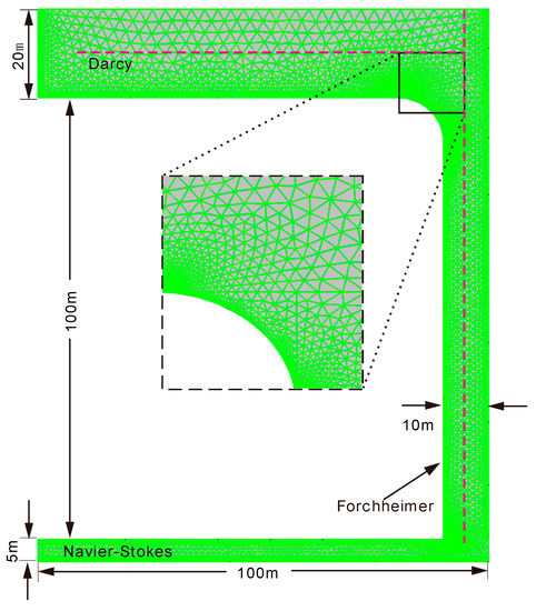 After comparing the change behavior of the water levels, a 2D finite-element numerical model developed with COMOSL (3.5a, COMSOL Inc., Stockholm, SWE 2018) Multiphysics was designed to study the lateral recharge and water seepage mechanisms of the aquifer. According to the geological conditions of the 8101 longwall face, the water seepage model was built based on the conservation of mass and the pressure equilibrium. The model consists of three parts, representing the overlying aquifer, the WFFZ and the roadway of the 8101 longwall face. The upper part is 100 m wide and 20 m thick, representing the Klzh unconfined aquifer in the lower series of the Cretaceous and the middle Jurassic coarse sandstone aquifer, and the corresponding physical field is Darcy flow. The middle part is 10 m wide and 100 m thick, and the corresponding physical field is high-speed Forchheimer flow, representing the water flowing fractured zone. The middle part was set on the right side of the model to simulate the case that the WFFZ connected to the corner of the aquifer. The lower part is 100 m wide and 5 m thick, representing the roadway of the 8101 working face, and the corresponding physical field is Navier–Stokes flow. The model is shown in Figure 6. The finite element method with local mesh refine strategy was adopted, and the model was divided into 7314 triangular elements.