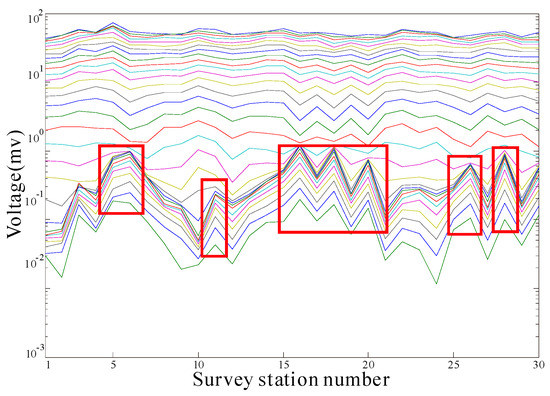 Comparison of the late time-induced electromotive forces. The horizontal axis represents the survey station number, the vertical axis represents the induced voltage, and the latter is logarithmic. The different colored lines refer to the curves of the induced electromotive forces of the different survey stations at the same time.