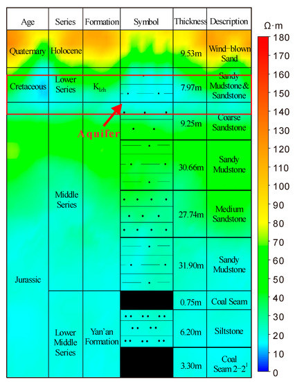 Figure 9 shows the TEM results without mining influence. The low resistivity area at a depth of 20–40 m corresponds to the Klzh unconfined aquifer in the lower series of the Cretaceous and the middle Jurassic coarse sandstone aquifer. The water level and volume of the aquifer remained unchanged without mining influence.