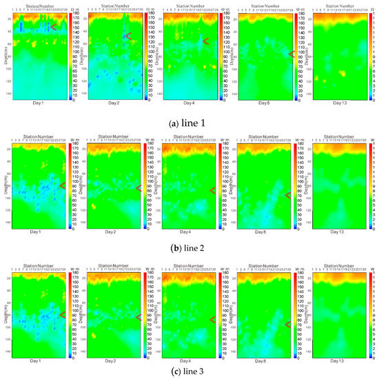 The survey results of line 1 are shown in Figure 10a. The footage of the longwall face on the first day of the survey was 1251.5 m, and the survey area was not affected by mining. The arrow indicates the location of the Klzh unconfined aquifer (apparent resistivity 15 Ω·m and below, at a depth of approximately 20–40 m). The water level was stable. Affected by mining, the water from the overlying aquifer began to flow down (to 60 m and below) by the second day. By the 4th day, the low resistivity area near a depth of 40 m had migrated downward to 60–80 m. This indicates that the water from the overlying aquifer continued to flow downward, and the yield of water decreased significantly compared to the second day. By the 8th day, the low resistance area near the original aquifer gradually disappeared, indicating that the water had moved downward to 80–100 m. Along with the diffusion of the low resistivity area, the resistivity became higher because there was no water supply from the surface. By the 13th day, the low resistivity area was almost the same as the 8th day, only more inconspicuous. The water distribution in the overlying strata had become stabilized.