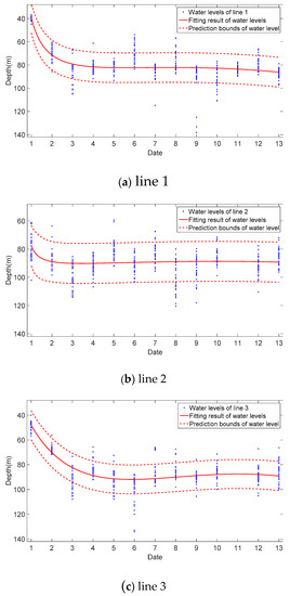 Through curve fitting, the change behavior of the water level for each survey line was obtained (Figure 11). It is obvious that the water levels of each survey line declined quickly during the mining process. After a short-term and rapid downward move, the seepage slowed down, and the water level tended to be stable because there was no surface water supply. The decline of the water level in line 1 lasted for three days, and the water tended to be stable after the 4th day of the survey. The decline times of line 2 and line 3 are two days and four days, respectively. The change rate of the water level for lines 1 and 3 are similar, while the change rate for line 2 is relatively fast. As mentioned before, the different change rates of line 2 could result from fault(s) in the overlying strata.