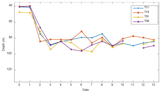 Comparison of water levels of different survey stations. The horizontal axis represents the survey days, and the vertical axis represents the water levels. The data of day 0 is the experimental data. T11 represents the survey data of 1st survey station of line 1. T13 represents the survey data of 30th survey station of line 1. T31 represents the survey data of 1st survey station of line 3. T33 represents the survey data of 30th survey station of line 1.