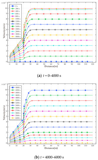 Figure 13 shows the water flow velocity of the vertical cut line. The flow velocity was 0 m/s at t = 0 s. When the water inflow was loaded (simulating the connection between the WFFZ and the aquifer), the water began to flow down. The flow velocity increased quickly and then tended to be stable after t = 2000 s. The maximum flow velocity of the model reached 1 × 10−2 m/s at t = 4000 s. As there was no water supply, the flow velocity gradually decreased after t = 4000 s and tended to be stable after t = 6000 s, with the maximum flow velocity of 1.5 × 10−5 m/s. In the vertical direction, the water flow velocity increased from the top of the aquifer to the roadway. The flow velocity reached the maximum at the position of 30 m (under the entrance of the WFFZ). As can be seen from Figure 13, there is an inflection of a sudden increase in flow velocity at 1 m beneath the top of the aquifer. That is because the flow velocity at the top of the aquifer was not affected by the lateral seepage while the lower part was affected. At the position of 20 m on the vertical line, another inflection of sudden increase occurred due to the great change of permeability and porosity at the interface of the aquifer and WFFZ. After a rapid increase, the flow velocity tended to be stable in the WFFZ.