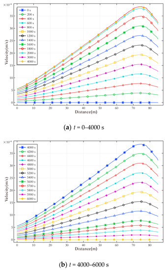 Figure 14 shows the water flow velocity of the horizontal cut line. The flow velocity in the aquifer also increased at first, then stabilized, decreased and finally stabilized. It can be seen that the lateral recharge phenomenon existed in the aquifer, which caused the increase of water flow velocity from left to right and reached the maximum at the position of 75 m. The maximum flow velocity in the aquifer was 3.9 × 10 −3 m/s at t = 4000 s, and occurred at 20 m to the right boundary of the aquifer, which was above the interface between the aquifer and the WFFZ. During the decline process of the water flow velocity in the aquifer, the gap between the velocity of the left and right side became smaller. The maximum flow velocity declined to 5.5 × 10−6 m/s at t = 6000 s, and the flow velocity at 50 m was 4.1 × 10−6 m/s. Since there was still an area of aquifer between them, it can be considered that the downward flow of water mainly came from the lateral recharge. Combining with Figure 15, the lateral recharge dominated the water flow at t = 6000 s and later.