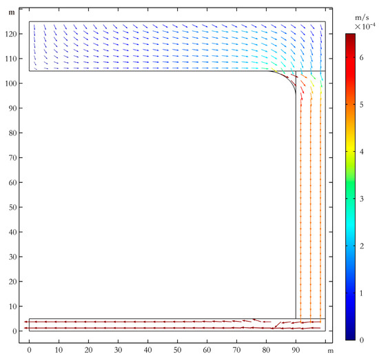The velocity arrow of the model at t = 6000 s. The color bar represents the flow velocity of the corresponding arrow.