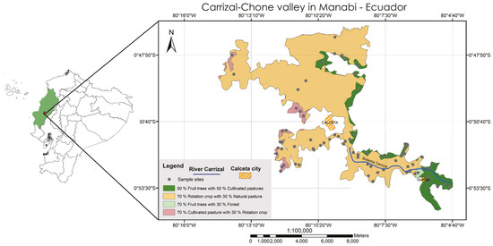 The work was carried out in the Carrizal-Chone System project (SCCH) area of interest, located in the central part of the Province of Manabí near the Chone and Tosagua counties. The study area is situated at 0°51′46″ S, 80°08′61″ W, and between 19 and 80 m.a.s.l. (Figure 1).