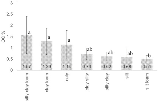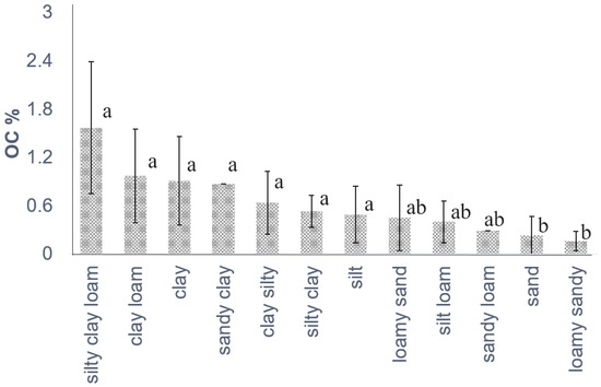 Distribution of soil-organic-carbon (SOC) concentration. Different letters indicate significant differences grouped by soil texture according to the Kruskal–Wallis test, (p < 0.05).