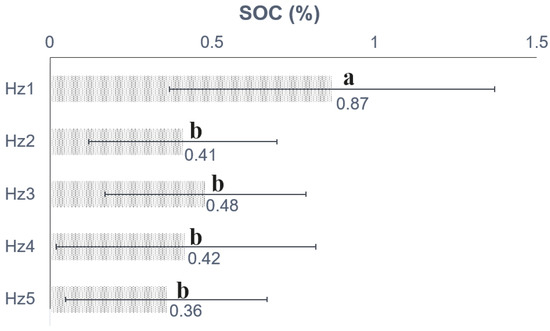SOC in%. Different letters indicate significant differences according to the Kruskal–Wallis test (p < 0.05). Horizon (Hz).