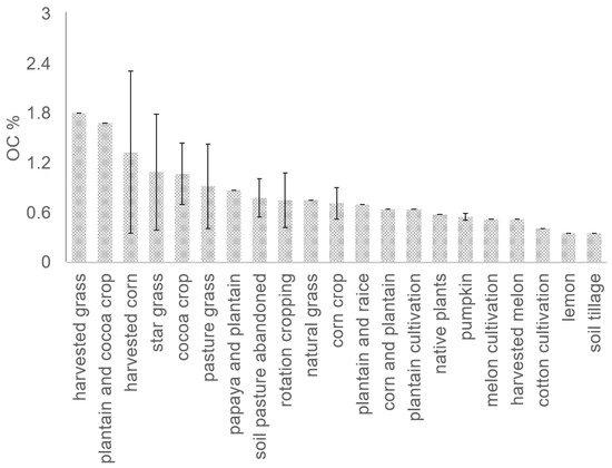 We determined the significant differences between 21 different soil-management types (p value > 0.999) using the Kruskal–Wallis test (Figure 5). The highest percentages of organic carbon were found in areas cultivated with banana and cocoa—1.80% and 1.68%, respectively. The percentages of organic carbon for soil used for maize and cacao were 1.33% and 1.07%, respectively; these were the management types with the highest organic-carbon concentrations in the surface horizon. The lowest values were found in soils used for lemon cultivation and in the area of land plowed for the preparation of rotation crop use, with 0.35% organic carbon in both cases. These organic-carbon-concentration values were determined from the surface 41 cm of soil—the average depth of the surface horizon in each profile was studied.