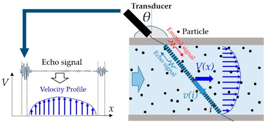 The UVP method can obtain instantaneous velocity profile of fluid using ultrasonic waves by means of an ultrasound reflector. Figure 1 displays the UVP principle, consisting of ultrasound transmission, an echo signal, and velocity profile obtained. An ultrasonic pulse is emitted repeatedly from the transducer along the measurement line, and the echo reflected from the surface of the reflector such as from a particle is derived from the same transducer. The particles dispersed in the fluid according to the main flow. In the case of water, the density of the particle is nearly equal (0.98 g/cm3). Therefore, the velocity of a particle is assumed to be equal to the velocity of water at that position. The echo signals reflected from moving particles contain the Doppler signal. The Doppler frequency fDi directly relates to the velocity of a moving particle at the position in measuring line. Consequently, the velocity of the particle V(x) can be obtained as follows in Equation (1). The velocity profile of the fluid along the channel diameter can be computed if tracer particles are sufficiently dispersed.
