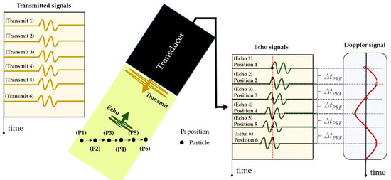 The Doppler pulse repetition technique is used to extract the Doppler signal from the echo signal, to estimate the Doppler frequency and calculate fluid velocity, respectively. The Doppler signal can be demodulated from echo signals reflected from a moving particle using ultrasonic emission repetition as shown in Figure 2. Figure 3 shows a block diagram of the UVP system based on the Doppler pulse repetition technique. An ultrasonic pulser/receiver, operated in the pulse-echo mode, emits an ultrasonic pulse through an ultrasonic transducer. The echo signal e(t) is then reflected and sent to the pulser/receiver via the same transducer [23]. It is expressed as: