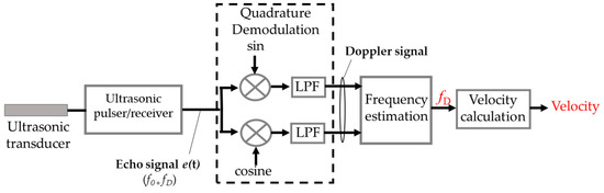 In the quadrature demodulation section, the echo signals are multiplied by the cosine and sine components, and a finite impulse response filter is then used as a low-pass filter to eliminate the carrier wave component or basic frequency. Therefore, the Doppler signal D(n) can be extracted from the echo signals as modeled in Equation (3)–(6) The Doppler frequency is then estimated in the frequency estimation section by autocorrelation or Fast Fourier Transform [23,24]. Finally, the computed Doppler frequency is plugged into Equation (1) to demonstrate fluid velocity.