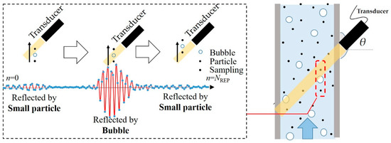 The UVP method is a real-time measurement for obtaining the velocity profile of fluid even though the fluid is opaque. The UVP is a non-intrusive measurement of the velocity profile. It does not require a transparent test section; the probe is installed at the outer wall of a pipe or channel. The UVP uses the pulsed echography of an ultrasonic wave reflected from a moving reflector such as particles dispersed in the fluid to measure the instantaneous velocity profile of fluid along its measurement line. Takeda [9] were the first to propose the UVP method for measuring single-phase liquid flow. The advantage of this technique is that it can perform spatial-temporal measurements of the velocity profile. Subsequently, Aritomi et al. [10,11,12] developed a hybrid system, combining the UVP system and video data processing unit to inspect the liquid and bubble velocity distributions, average bubble diameter, and the void fraction in two-phase bubbly flows. The hybrid system applies the statistical method to classify the velocity profile of both phases. However, the limitation in separation occurs when there is not much difference in the velocity of both phases. Suzuki et al. [13] proposed a phase-separation technique reliant on the UVP method as well. This method applied the pattern recognition of the velocity profile to distinguish a phase of the velocity profile. However, the technique could only be applied in limited flow conditions. Yamanaka et al. [14] proposed a separation technique, using the differences in ultrasonic intensity reflected from particles and bubbles in two-phase bubbly flows. It is clear that the ultrasonic intensity reflected from a bubble’s surface is stronger than a particle dispersed in liquid because of the differences in acoustic impedance. Murakawa et al. [15] employed a multi-wave TDX transducer and the time domain cross-correlation method (UTDC) to measure liquid and bubble velocity profiles with pattern recognition of ultrasonic echo amplitude. Then, Nguyen et al. [16] employed a multi-wave TDX transducer and the Doppler pulse repetition method to measure and separate liquid and the bubble velocity profile. Although both techniques could synchronize the instantaneous velocity of both liquid and bubble, they require more devices since two resonant frequencies are needed. As a consequence, twice the amount of pulser/receiver and data processing equipment is required. Therefore, for minimizing the measuring equipment, the measurement system that employs only a single resonant frequency is needed.