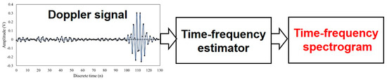 Several types of time-frequency estimator such as STFT, Gabor [25] and Wigner–Ville distribution (WVD) [26] can analyze time-frequency behavior of non-stationary signal which is the same kind of Doppler signal. Each type has advantage and disadvantage. Therefore, the performance of estimators must be evaluated before applying to the measurement system. The performance is evaluated in three indicators; Readability, Resolution and Computational time. The investigation was performed by using one Doppler signal obtained from two-phase bubbly flow as shown in Figure 5. Then, the signal was inputted to the algorithm of three estimators on LabVIEW software. Figure 6a–c are time-frequency spectrogram of Doppler signal obtained from STFT, Gabor and WVD, respectively. The evaluation of three estimators is shown in Table 1 and Table 2. It can be concluded that Short-Time Fourier Transform has a good performance in three criteria (Readability, Resolution and Computational time). Therefore, STFT is selected to be time-frequency estimator in the phase-separation technique.
