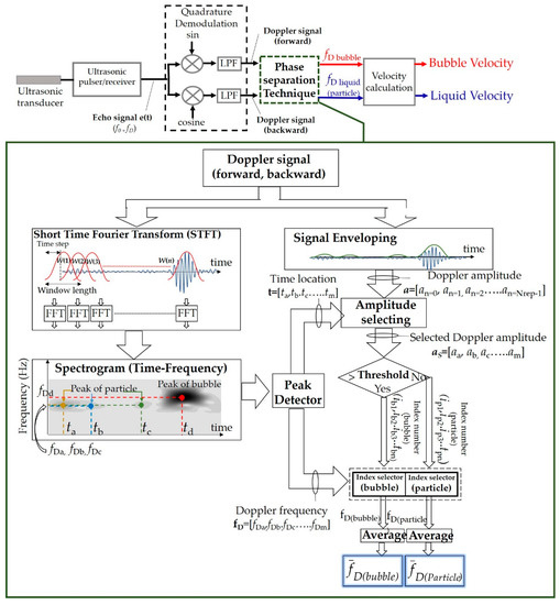 The STFT analyzes the time-frequency effect of the Doppler signal. The classification of Doppler amplitude is performed by setting a threshold. The threshold value is based on the statistical data of Doppler amplitude reflected by particles and bubbles. The phase-separation technique is applied for operation in the UVP by replacing the frequency estimation section. Figure 7 demonstrates the process of the phase-separation technique.