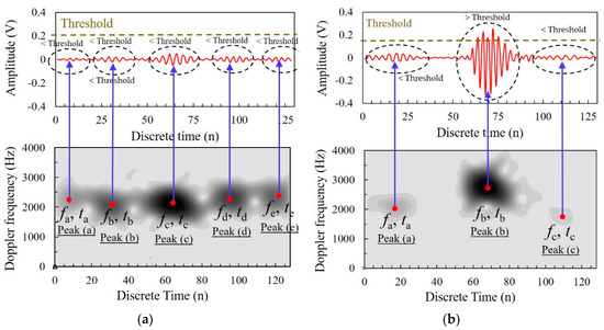 Figure 9a represents an example of the Doppler frequency classification for the proposed technique in one measurement channel, showing the processing system on single-phase flow. The Doppler frequencies observed from the peak on the spectrogram are only influenced by particles because the Doppler amplitude of each time location point is lower than the threshold value. Figure 9b shows the spectrogram in two-phase bubbly flow conditions. The frequency data at points a, and c can be defined as the Doppler frequency of a particle due to Doppler amplitude being lower than the threshold value. On the contrary, at point b, the Doppler frequency belongs to a bubble because Doppler amplitude is higher than the threshold value.