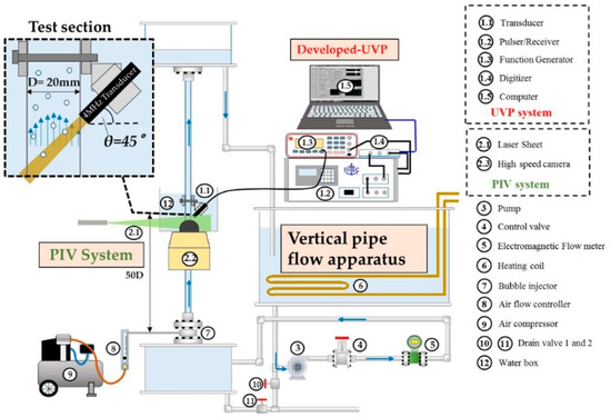 Two-phase bubbly flow is a common phenomenon in many industrial processes such as chemical production, thermal power plants, and nuclear reactors. In Light-Water Reactor (LWR) nuclear power plants, especially those involving the Boiling Water Reactor (BWR), the phenomenon occurs with coolant in the nuclear reactor core and influences plant operation, i.e., the power level of the reactor and safety function. To understand the characteristics of this phenomenon, multi-scale modeling has been developed to analyze and predict the characteristic of two-phase bubbly flow [1,2]. It employs many empirical correlations and consecutive equations such as bubble and liquid velocity, bubble size distribution, slip ratio, and so on. To provide a reliable database for two-phase flow models, the interaction between two phases and its behavior must be clarified by experimental work, in particular, velocity distribution of liquid and bubble. Hence, it is necessary for the velocity profile of the two-phase bubbly flow to be accurate. Several intrusive measurement techniques have been used to measure the velocity profile in two-phase bubbly flow such as hot-film anemometry [3] and the conductive probe [4,5]. Intrusive techniques disturb the flow and lead to lifetime distortion. To eliminate these effects, non-intrusive measurement techniques are proposed, such as laser Doppler anemometry (LDA) [6] and Particle Image Velocimetry (PIV) [7,8]. These techniques are used for measuring the rising velocity of a single bubble or a few bubbles. However, both methods require a transparent test section and obviously fail if the working fluid is opaque. Also, the measurement result is typically obtained from the offline analysis because of the time-consuming image processing.