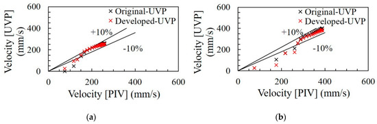 Measurement results for the single-phase liquid velocity profile: (a) UL = 200 mm/s and (b) UL = 300 mm/s.