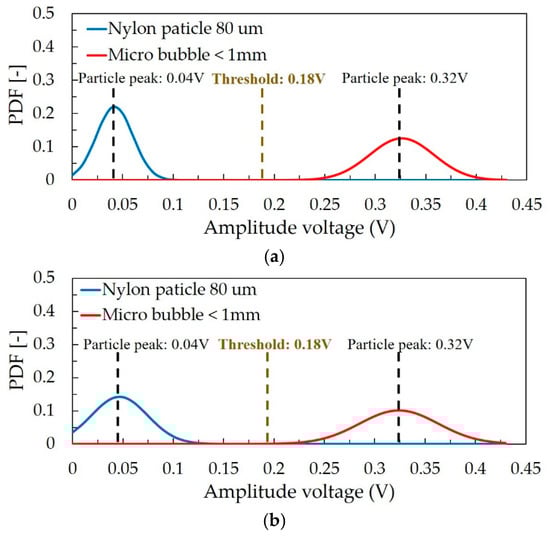 Doppler amplitude threshold setting on probability density function (PDF) of Doppler amplitude reflected by nylon particles 80 µm and microbubble <1 mm; (a) at UL: 200 mm/s and (b) at UL: 300 mm/s.