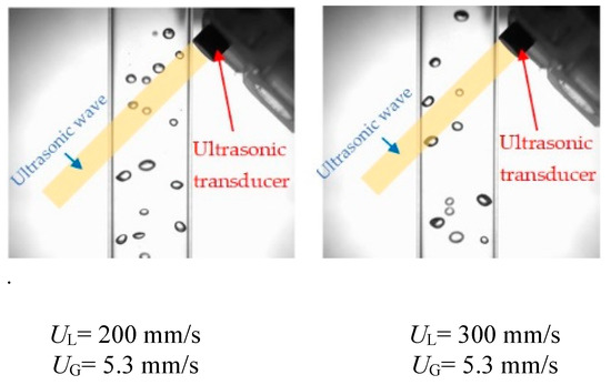 Figure 13 represents the probability density function (PDF) of Doppler amplitude reflected in two conditions; nylon particles 80 µm and microbubbles <1 mm at UL: 200 mm/s and 300 mm/s, respectively. An evaluation was carried out by observing the maximum of Doppler amplitude data of 30,000 Doppler signals in each condition. Whenever a nylon particle was dispersed into the water, the distribution of PDF of Doppler amplitude voltage occurred during 0–0.1 V at UL: 200 mm/s and 300 mm/s. The peak was observed at about 0.04 V. Furthermore, a large number of bubbles at the microscale (diameter <1 mm) were injected into the water without any nylon particles. Clearly, the PDF of Doppler amplitude voltage was distributed between 0.25 V and 0.4 V at both velocity levels of liquid. The peak was observed at about 0.32 V. Hence, it can be concluded that the Doppler amplitude reflected by a particle and bubble is obviously different.