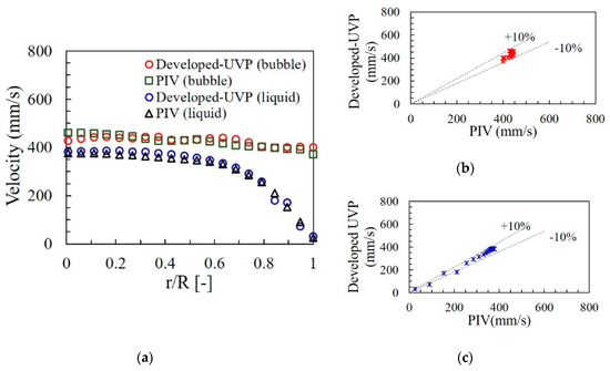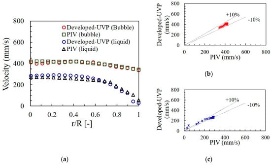 Next, The UL increased to 300 mm/s, but gas superficial velocity remained similar to the previous case. The bubble diameter was still about 2–3 mm. Figure 17a represents that the velocity profile of bubble and liquid was obtained separately. Good agreement in the velocity profile measurement of both phases was observed between the Developed-UVP and PIV method due to the discrepancy of both systems was within an acceptable range of ±10% as illustrated in Figure 17b,c, respectively.
