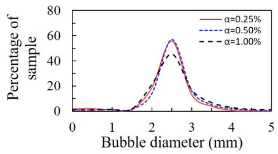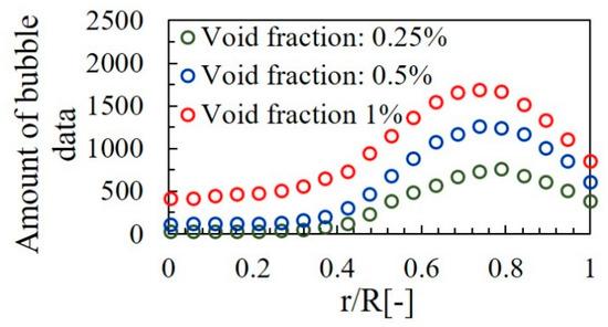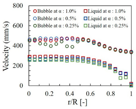 The experiment was conducted on UL = 200 mm/s at different void fraction (α); 0.25%, 0.50% and 1.00%. From the visual observations as shown in Figure 18, the bubble shape was mostly spherical. In the present study, the effects of different bubble shapes will not be taken into account. It was confirmed that the flow regime was mono-dispersed flow regime with the bubble diameter was about 2–3 mm as represented in Figure 19. In this flow regime, the bubbles are uniformly distributed in the cross-section of the pipe, traveling vertically with minor transverse and axial oscillations [34]. Figure 20 represents the measurement results obtained by Developed-UVP. The graph shows the average velocity profile of both phases. The liquid velocity profile is the mean of 5000 profiles and bubble velocity profile is averaged by the amount of data obtained as shown in Figure 21.
