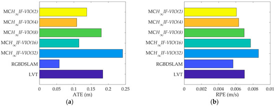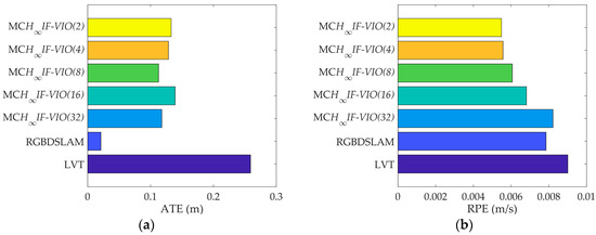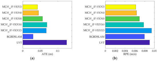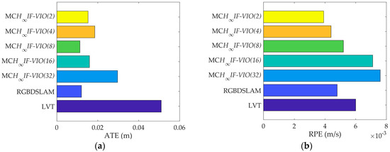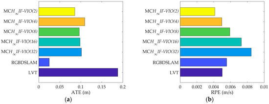 The RPE of MCH∞IF-VIO increased along with the patch size in all of the tests. The change in the ATE of MCH∞IF-VIO was similar to RPE with some exceptions. This is in line with the common knowledge that more measurements lead to better accuracy in visual navigation. The MCH∞IF-VIO in this paper and LVT are dead-reckoning algorithms, while RGBDSLAM is a compete SLAM algorithm with joint optimization and loop-closure. Therefore, RGBDSLAM is more consistent globally than MCH∞IF-VIO and LVT according to the ATE results. In our tests, MCH∞IF-VIO achieved a smaller ATE than LVT with only one exception, where the ATE of MCH∞IF-VIO(32) was larger than LVT in the test on fr1_room. MCH∞IF-VIO(2) had the smallest RPE in all of the tests. The estimation errors caused by the IMU measurement noises increased over time. Moreover, the simple frame-to-frame alignment used in the measurement-update phase was less robust than the optimization with the global and local map used in RGBDSLAM and LVT. Therefore, the performance of MCH∞IF-VIO in the test with long duration such as fr3_office was less distinctive.
