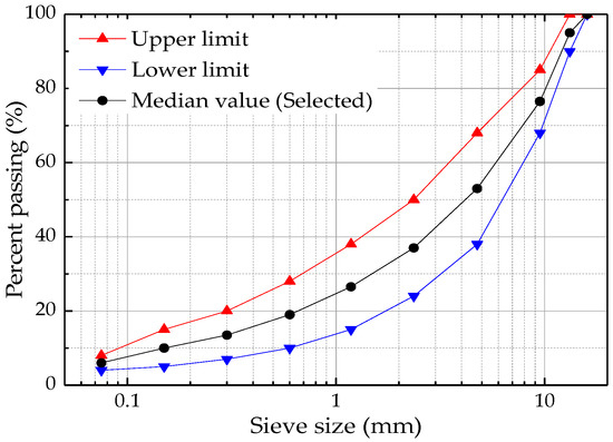 Traditional dense-graded asphalt mixture is a well-graded asphalt mixture and is applied extensively in asphalt pavement construction in China [42]. In this study, the median gradation of asphalt mixture (AC-13) was selected, as shown in Figure 1, and the upper and lower limits of AC-13 are also illustrated. Asphalt mixtures reinforced with eco-friendly basalt fiber were made by a standard Marshall design method [43,44] approximately 0.4% basalt fiber with a length of 6 mm was added into asphalt mixtures. In accordance to JTG E20-2011 [45], the detailed preparation procedures are presented as follows: