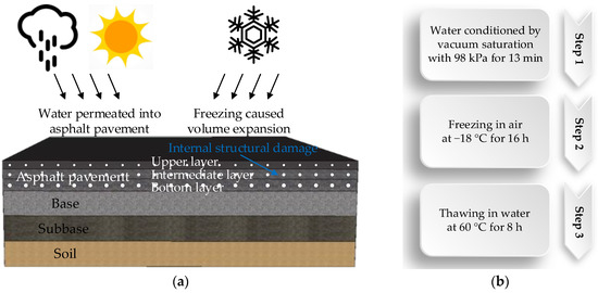 Figure 2 gives a detailed description of the freeze-thaw cycles in this study, in which the real simulation is shown in Figure 2a, and the one-time freeze-thaw cycle in the laboratory is shown in Figure 2b. Before the freeze-thaw cycle test, specimens were immersed into water and under vacuum (98.0 kPa) for 15 min, and soaked under atmospheric pressure for 30 min. Then, a one-time freeze-thaw cycle was carried out on specimens, in which the freezing condition of the refrigerator was set as −18 °C for 16 h, and the thaw condition of the thermostatic waterbath was in water at 60 °C for 8 h. A number of 84 specimens were treated for the freeze-thaw cycle test, in which each freeze-thaw cycle had 3 replicates. After 0, 1, 3, 6, 9, 12, and 15 freeze-thaw cycles, the experimental tests were carried out for asphalt mixtures.