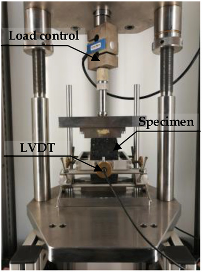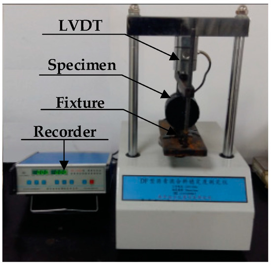 A splitting test reflects mechanical performance at the moment of splitting, failure under specific temperature, and loading rate. Splitting tensile strength (STS) is considered as an effective indicator for asphalt mixture, and it is also widely used in many studies [46,47]. According to T0716 in JTG E20-2011 [45], the splitting tensile strength test shown in Figure 3 was performed at 15 °C by the Marshall apparatus, with a load of speed of 50 mm/min until the specimen was broken. The deformation was measured by linear variable differential transformers (LVDT). Then, the splitting tensile strength was calculated by the following equation: