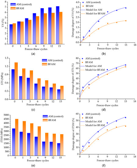 The VA, STS, and ITSM of AM and BFAM varying with freeze-thaw cycles are plotted in Figure 5a,c,e, and the corresponding damage degree results are shown in Figure 5b,d,f, in which the logistic models are expressed in curves with uncertain data. Based on the logistic damage model theory in the Section 2.4.1, the logistic damage models of VA, STS, and ITSM for AM and BFAM could be established and listed in Table 2. These logistic damage models could be proven effective, due to the higher correlation coefficients R2 above 0.97 and Adj. R-Squared values in Table 2 represent the fitting parameter accuracy. As plotted in Figure 5a,c,e, it can be clearly seen that the VA results of asphalt mixtures gradually increased with the increasing of the freeze-thaw cycles, whereas the STS and ITSM results presented a decreasing trend. Simultaneously, Figure 5b,d,f illustrate that asphalt mixtures were gradually damaged with freeze-thaw cycles. Furthermore, the variation trend of the damage degree of the asphalt mixtures increased rapidly at first and then more slowly. Under the action of freeze-thaw cycles, the internal structure of asphalt mixtures was damaged due to volume expansion and temperature stress. The adhesion capability between asphalt and aggregates became weaker and weaker under the continuous action of freeze-thaw cycles. Before 9 freeze-thaw cycles, the air voids in asphalt mixture first extended and then, adjacent air voids were coalesced, leading to the significant variation trend. However, the expansion and formation of air voids became slow after 9 freeze-thaw cycles.