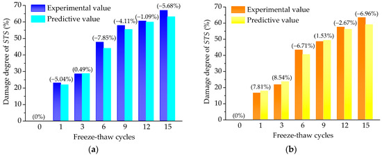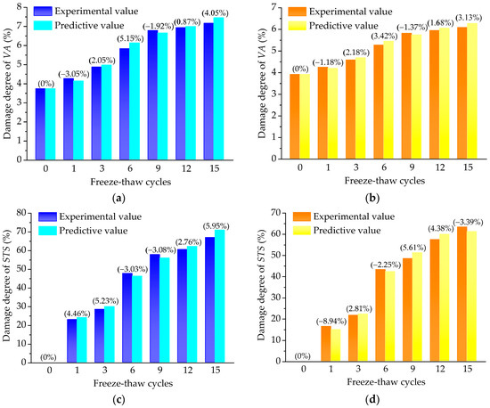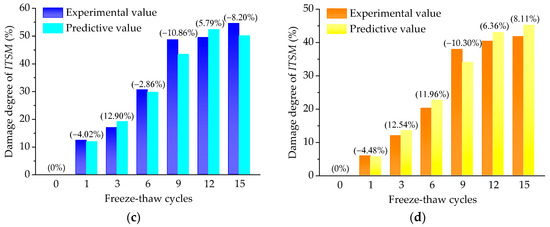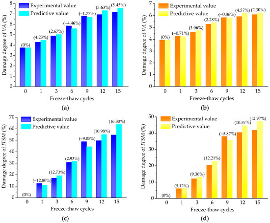 Comparison between predictive and experimental values for AM and BFAM based on GM (1,2) of STS and ITSM tests: (a) Damage degree of STS for AM; (b) Damage degree of STS for BFAM; (c) Damage degree of ITSM for AM; (d) Damage degree of ITSM for BFAM.