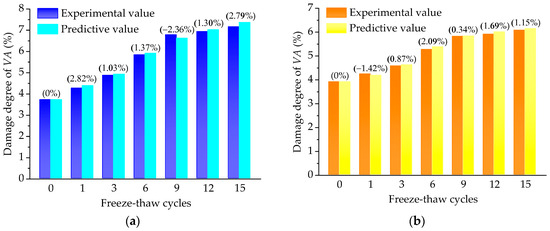 The predictive values of VA and STS compared with the experimental results are presented in Figure 6, based on the grey model GM (1,2) of VA and STS tests. It is apparent that the relative errors for VA of AM and BFAM are within 6%, and the relative errors of STS of AM and BFAM are around 10%.