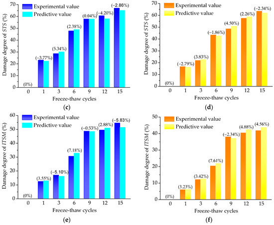 Comparison between predictive and experimental values for AM and BFAM based on GM (1,3) of VA, STS, and ITSM tests: (a) Damage degree of VA for AM; (b) Damage degree of VA for BFAM; (c) Damage degree of STS for AM; (d) Damage degree of STS for BFAM; (e) Damage degree of ITSM for AM; (f) Damage degree of ITSM for BFAM.