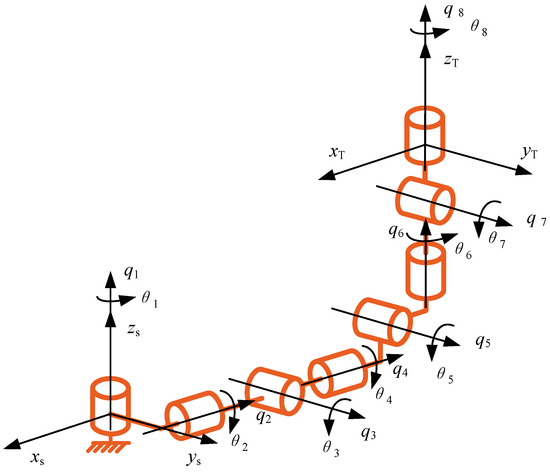 Equation (8) can formulate the forward kinematic equation of an 8-DOF serial industrial robot shown in