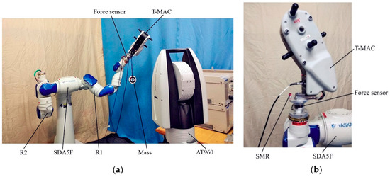 Figure 3a shows that a mass block was applied to the robot EE. The Leica Geosystems Absolute Tracker (AT960) was fixed outside the workspace of SDA5F.