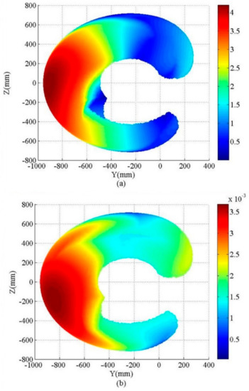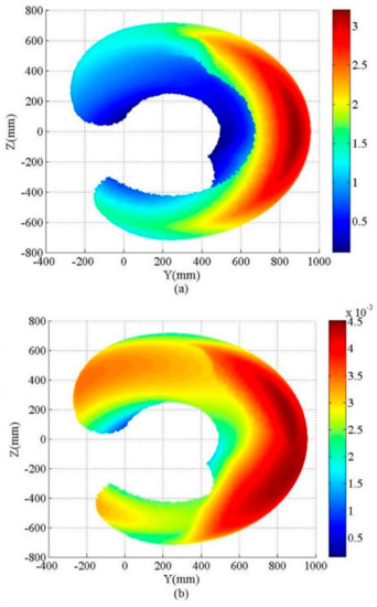 Figure 5 depict the error between the nominal pose and the actual pose caused by the deformation throughout the robot workspace. The analysis result shows that the position error of R1 was in the range [0, 3.5] (in millimeters), and the orientation error of R1 was in the range [0, 0.0045] (in radians). The position error of R2 was in the range [0, 4.2] (in millimeters), and the orientation error of R2 was in the range [0, 0.0037] (in radians). The different deformation between the two arms was because of the difference in the mechanism and the measurement results.