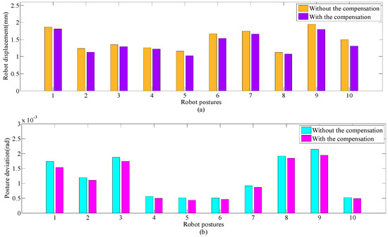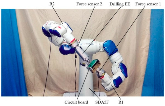 Figure 6 shows the experimental setup. Two six-axis force sensors were mounted on the flanges of R1 and R2, respectively. The circuit board was fixed by the fastening tool, which was mounted on the force sensor 1. The drilling EE was mounted on one side of the force sensor 2. The weights of the drilling EE, fastening tool, and force sensors were measured before their installation. From Equation (44), the deformation can be calculated and compensated to the pose control of the robot. Ten poses were measured with and without the compensation first, and the results were used to calculate the deformation as shown in