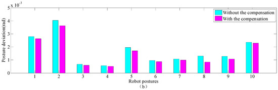 Figure 9b shows that the orientation error is better than the before, as expected after the calibration as well. The identification results show that the joint stiffness of the SDA5F robot was not very small, thus there were slight drops in the errors. Furthermore, the residual errors were caused mainly by the geometrical kinematic errors of the robot that were beyond the aspect of this paper. Nevertheless,