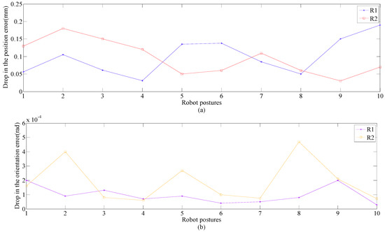 Figure 8b illustrates the orientation errors of R2, and the maximum orientation value is less than 0.0037 rad.