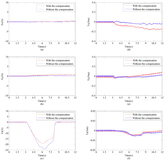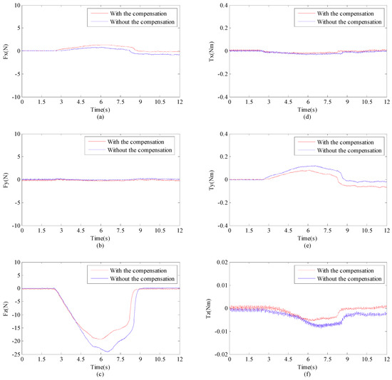 Figure 11 shows the force and torque curves of R2 before and after the compensation.