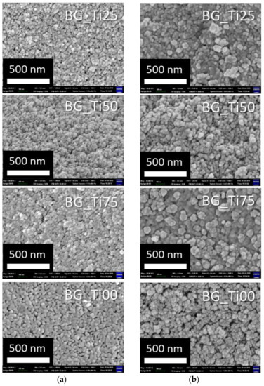 The microstructure of bioceramics composed of silica and titanium oxide with various concentrations of titanium oxide soaking in SBF for 0 and 7 days are shown in Figure 1. At 0 days of soaking in SBF, the size of the bioceramic particles, though not very evident, become bigger from BG_Ti25 to BG_Ti00. At 7 days of soaking in SBF, it is obvious that mineral deposits on the sample surface and the particles also become bigger from BG_Ti25 to BG_Ti00. The particle also formed a cluster-like deposition on the BG_Ti00 surface. It showed the various microstructures on the sample surface after soaking in SBF for 7 days.